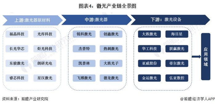 历经多年的发展,中国激光技术已广泛应用于各行各业,形成了完整的产业链。激光产业链上游主要包括光源材料、光学元器件及其他组成激光器的材料;中游主要为各种激光器、机械系统、数控系统,其他例如电源、散热器、传感器、分析仪、防护镜等;下游则是成套的激光设备,如激光切割机、激光焊接设备、激光打标机等。激光产业链的终端应用领域涉及交通、医疗、电池、家电、商业用途等。