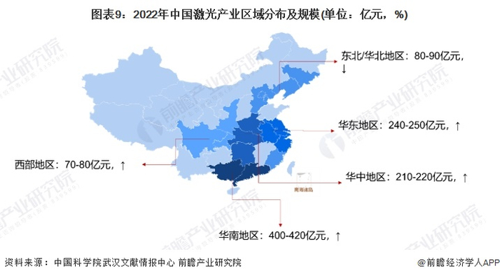 根据《2023中国激光产业发展报告》,2022年,包括广西和广东的华南地区,激光产业规模为400-420亿元,且呈上涨趋势;包括河南、湖北、湖南的华中地区激光产业规模为210-220亿元,且呈上涨趋势;包括江苏、安徽、上海、浙江、福建的华东地区激光产业规模为240-250亿元,且呈上涨趋势;包括吉林、辽宁、北京、天津、河北的东北/华北区域产业规模为80-90亿元,且呈下降趋势,主要是由于近年来从北京迁出很多一些企业,往沿海和东部地区发展;包括陕西、四川、重庆的西部地区产值规模为70-80亿元,且呈上涨趋势。其中华南地区产值规模增长最快。