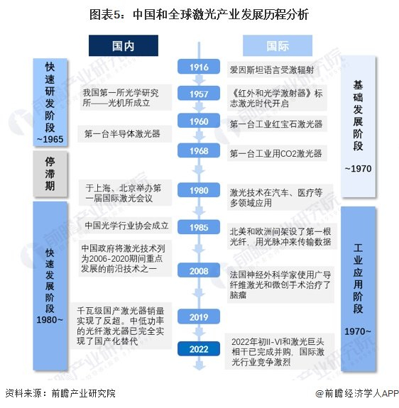 中国激光技术起步较早,1960年世界上第一台激光器在美国诞生以后,我国也于1961年研制出第一台红宝石激光器,此后我国激光产业进入技术快速研发阶段,在此阶段我国激光产业主要依靠科研机构和企业自主创新,通过引进和消化吸收国外先进技术,逐步提高技术水平和产能。