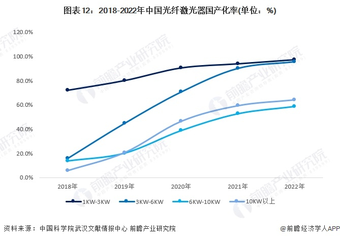 根据中国科学院武汉文献情报中心发布的数据,从市场渗透率来看,在1-3KW功率段光纤激光器市场,2022年国产光纤激光器市场份额达97.3%,已基本实现国产化;在3-6KW功率段光纤激光器市场,国产激光器渗透率由2018年的15.8%迅速提升至2022年的95.7%;在6-10KW功率段光纤激光器市场,2022年国产渗透率达到58.6%。在10KW以上功率段光纤激光器市场,国产激光器渗透率更是从2018年的5.7%快速增长至2022年的64.1%。3~10kW产品段国内市场的竞争趋于白热化,价格战主战场也从1-3kW产品段,转移至6-10kW产品段,万瓦级成了各厂家角力的焦点,光纤激光器国产替代的趋势也逐渐向万瓦延伸。随着激光器国产替代的持续推进,未来我国激光产业国产替代是必然趋势。