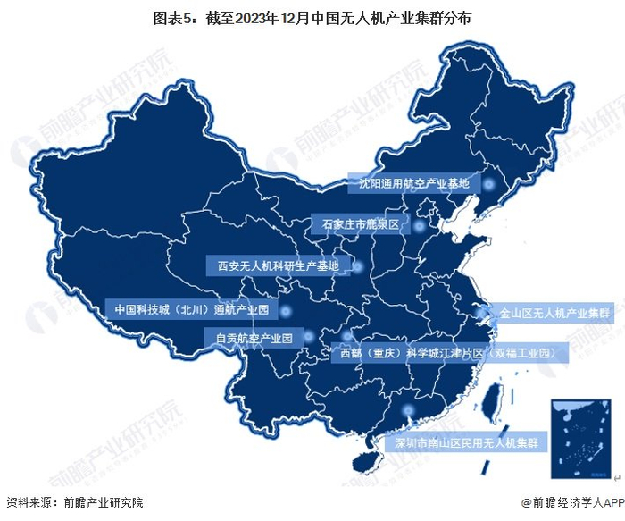 截至2023年12月,我国在四川、重庆、上海、广东、河北、辽宁、陕西均有无人机产业集群的分布,其中四川省有自贡航空产业园、中国科技城(北川)通航产业园两个无人机产业集群。产业集群具体分布及基本情况如下: