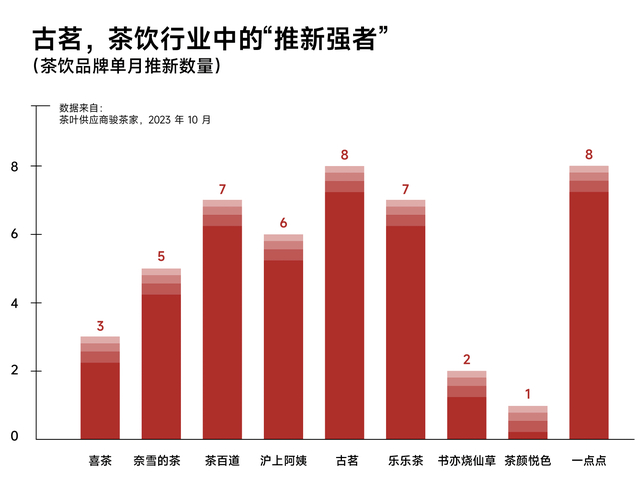 而古茗则侧重在产品研发能力、品牌形象与数字化管理上——平均每个月11.8款新品,远高于茶饮行业平均水准的推新速度,可以为加盟商持续带来客源。
