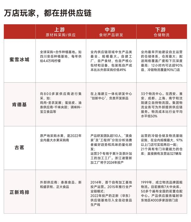 以蜜雪冰城为例,这家披着茶饮外衣的食品供应链公司,将低价和加盟做到了极致——饮品单价约6元;仅花2年就从10000店开到了20000店,平均不到2小时新开一家店——都得益于它对供应链的重投入:最早设立中央工厂的茶饮企业,持续投入50亿元建工厂和物流,不光实现了核心饮品食材100%自产,还与更上游的种植基地合作。它的爆品冰鲜柠檬水,自2013年推出后,10年卖出9亿多杯,成了茶饮界销量第一的常青品,也让蜜雪冰城成了业内最大的柠檬采购商。
