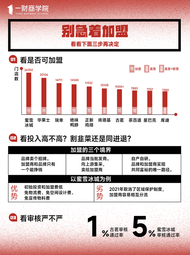 据红餐网援引业内人士采访,古茗对加盟商的挑选概率大概是100人申请,能通过1个——1%的通过率。相比之下,蜜雪冰城有5%的加盟申请通过率。