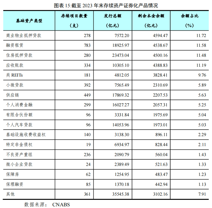 截至2023年末,资产证券化市场存续的产品一共有4115单,其中CMBS/CMBN 278单,未偿本金4594.47亿元;融资租赁783单,未偿本金4538.67亿元;RMBS280单,未偿本金4500.16亿元,分别位列第一、第二和第三。
