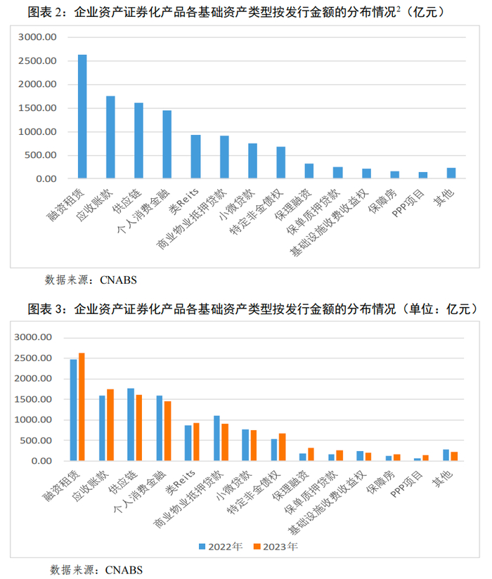2023年,企业资产证券化产品共发行了1262单,发行规模共计12040.71亿元,基础资产以融资租赁应收款、应收账款、供应链应收款、个人消费金融、类REITs和商业物业抵押贷款(以下简称“CMBS[1]”)为主。其中,融资租赁应收款是资产证券化业务的传统基础资产类型之一,此类基础资产的发行规模近年来维持增长态势。2023年全年融资租赁资产证券化产品的发行规模为2634.68亿元,较2022年增加6.63%。以一般融资租赁和交通工具融资租赁为基础资产的资产支持证券分别发行202单和47单,发行规模分别为2127.12亿元和491.36亿元。应收账款资产支持证券是以原始权益人/发起机构拥有的应收账款及其附属担保权益为基础资产的金融工具,提高企业融资能力和融资效率。2023年全年应收账款资产支持证券发行了107单,发行规模为1751.26亿元,位居第二,发行规模较2022年增加10.46%。供应链资产支持证券发行了285单,发行规模为1611.08亿元,位居第三,但其发行单数和发行规模较2022年分别下降6.86%和8.50%。此类产品多采用应收账款的反向保理模式,以高信用评级的企业作为核心债务人或差额支付承诺人,以出具付款确认书或差额支付承诺函的形式为证券化产品提供信用增进,有助于中小供应商及时回款,缓解资金压力,降低融资成本。个人消费金融、类REITs和商业物业抵押贷款分别发行了197单、42单和61单,发行总额分别为1454.82亿元、933.99亿元和911.02亿元。