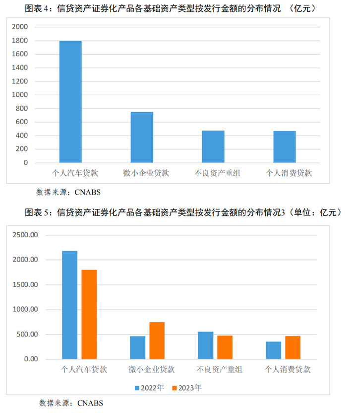 2023年信贷资产证券化产品共发行了201单,发行规模共计3495.69亿元。信贷资产证券化的基础资产以汽车贷款为主,汽车贷款资产支持证券发行了38单,发行规模1799.77亿元,位居第一。企业贷款资产支持证券(以下简称“CLO”)发行了19单,发行规模总额为749.72亿元,位居第二,基础资产均为微小企业贷款;不良资产资产支持证券发行了118单,发行规模总额为476.51亿元,位居第三,基础资产以不良住房抵押贷款以及信用卡消费贷款为主。2023年未发行住房抵押贷款资产证券化产品(以下简称“RMBS”)。