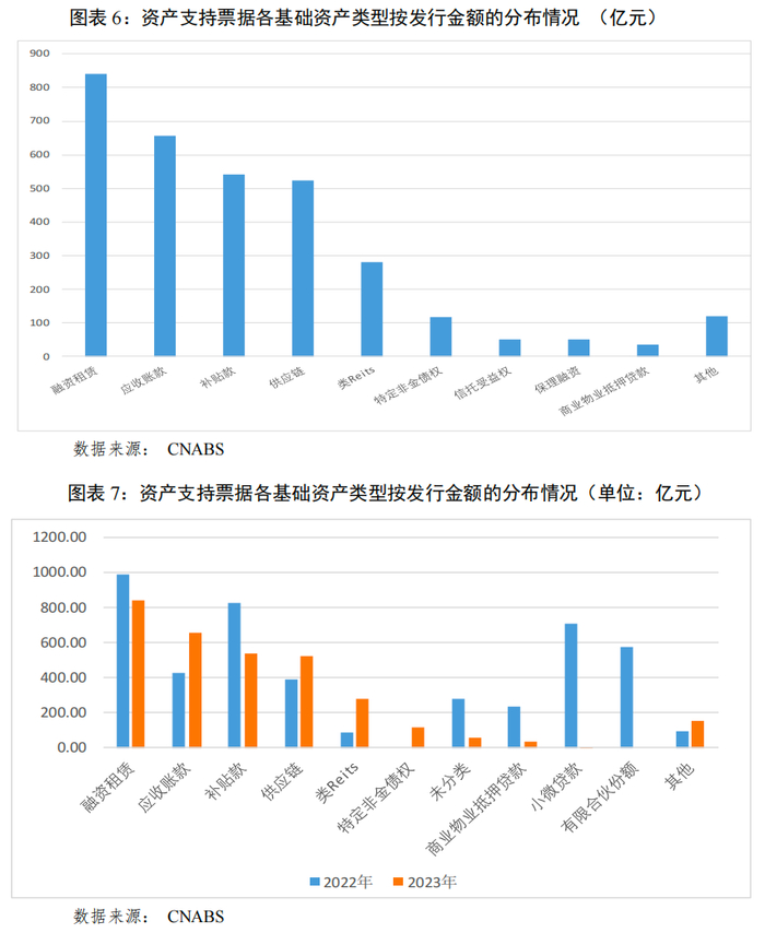 2023年,资产支持票据共发行了340单,发行规模共计3216.12亿元。资产支持票据的基础资产以融资租赁、应收账款、补贴款和供应链应收款为主,分别发行了89单、58单、26单和107单;发行规模总额分别为839.67亿元、657.84亿元、541.67亿元和523.20亿元;发行规模分别占发行总额26.11%、20.45%、16.84%和16.27%。2023年全年仅发行了1单以小额贷款为基础资产的资产支持票据,发行规模为5.00亿元。
