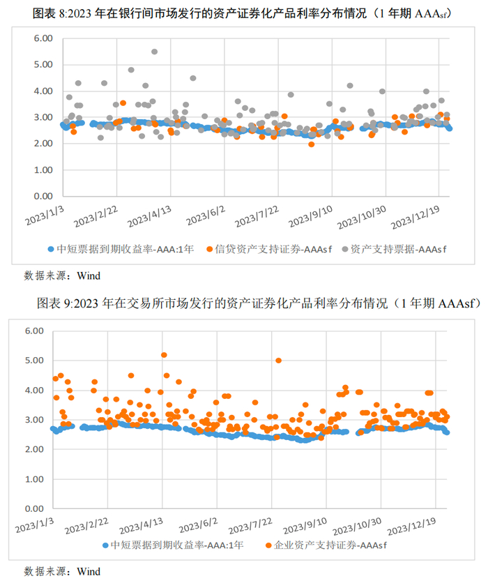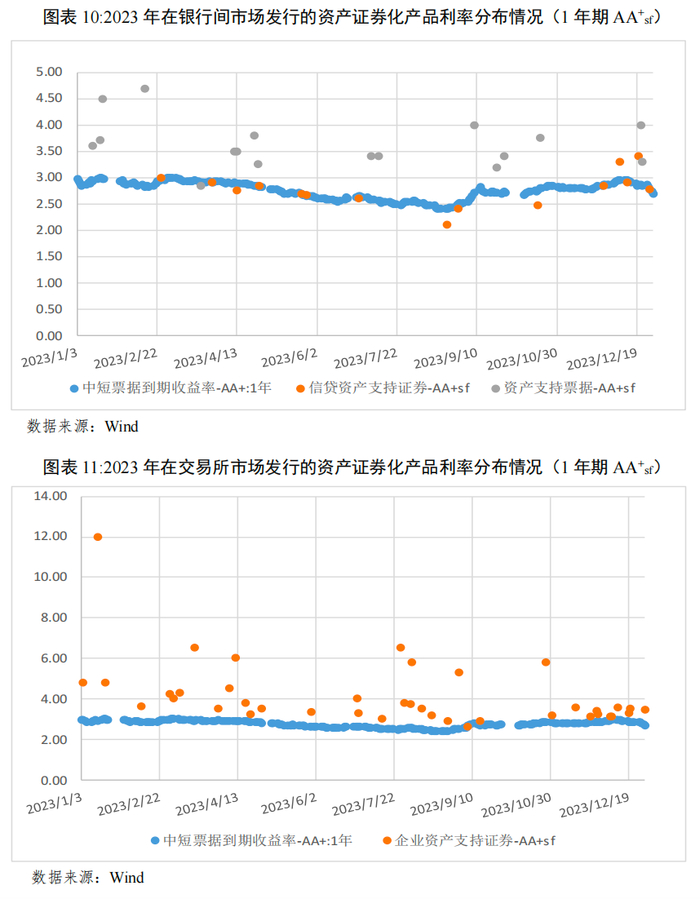 2023年发行的资产证券化产品中,信用级别为AAAsf级,且期限在1年之内的优先档的利率主要分布在2.00%至4.00%之间。相对债券而言,因资产证券化产品流动性偏弱,故大部分资产证券化产品的利率都高于同信用级别、相似期限的中短期票据到期收益率。