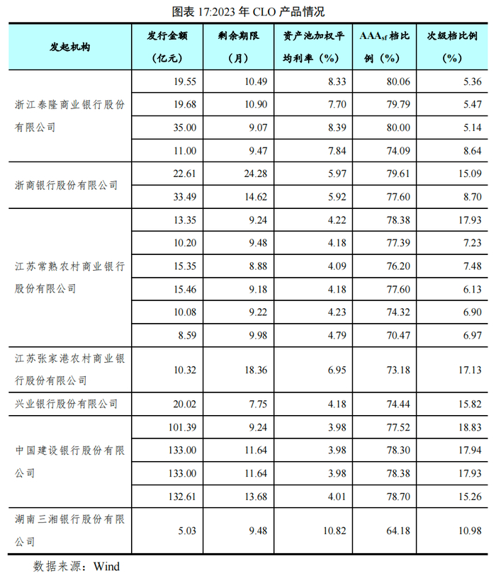 2023年,CLO一共发行了19单,基础资产均为微小企业贷款,发行金额合计749.72亿元。整体而言,三湘银行以及泰隆银行为发起机构的入池资产加权平均收益率维持相对较高水平。