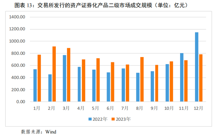 2023年,交易所和银行间发行的资产证券化产品的二级市场成交金额分别为8753.65亿元和8928.34亿元。总体来看,在交易所发行的资产证券化产品的二级市场交易量较2022年有所增加,但银行间市场发行的资产证券化产品的二级市场交易量较2022年大幅减少。