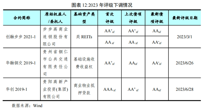2023年,共有3支资产证券化产品的评级发生了下调,涉及3个原始权益人/委托人,对应的基础资产主要为零售物业、基础设施收费收益权以及商业物业等。
