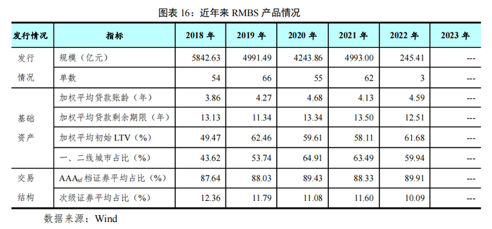 2023年未发行新的RMBS产品。在“房住不炒”的大背景下,当前房地产市场环境仍整体偏紧,近年来一定程度上对RMBS的发行规模有所影响。从近年来RMBS产品的发行情况来看,RMBS有基础资产加权剩余期限长和单笔规模大的特征,入池资产的加权平均初始LTV[4]近三年来在60.00%附近上下波动,基础资产中一、二线城市的住宅占比亦处于较高水平。
