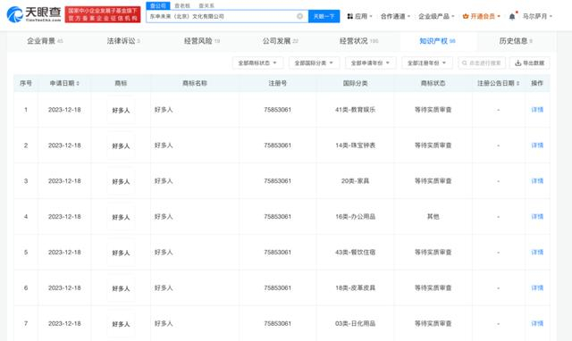 天眼查App显示,近日,陈坤和周迅联手创办的东申未来(北京)文化有限公司申请注册多枚“好多人”商标,国际分类包括教育娱乐、珠宝钟表、日化用品等,当前商标状态为等待实质审查。