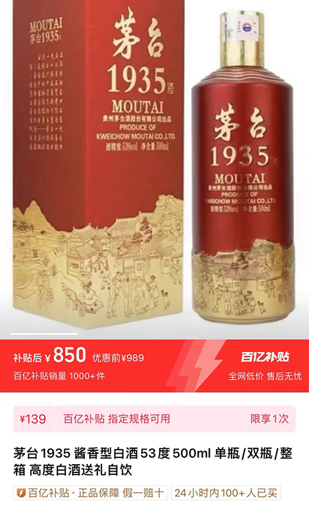 同时,烈酒商业在多个互联网电商平台也发现,茅台1935的价格已探底至900元以下。在某电商平台的官方百亿补贴频道,茅台1935已跌入800-900元区间,近期最低时消费者以820元出头的价格即可下单购买。