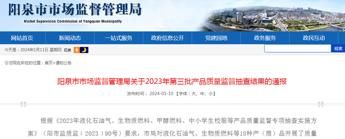 根据《2023年液化石油气、生物质燃料、甲醇燃料、中小学生校服等产品质量监督专项抽查实施方案》(阳市监质监﹝2023﹞90号)要求,市局对液化石油气、生物质燃料等18种产(商)品开展了质量监督抽查,现将抽查情况通报如下: