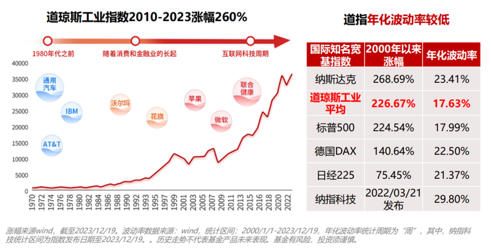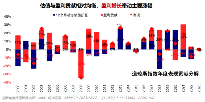 其次,道琼斯工业指数的投资底色是稳健和价值。通过对道指的历史表现进行拆解,道指从2000年至今225%的涨幅中,估值收缩占25%,盈利扩张占334%,在2009、2010、2021年等涨幅相对较大的时期,盈利增长的贡献远高于估值扩张贡献。