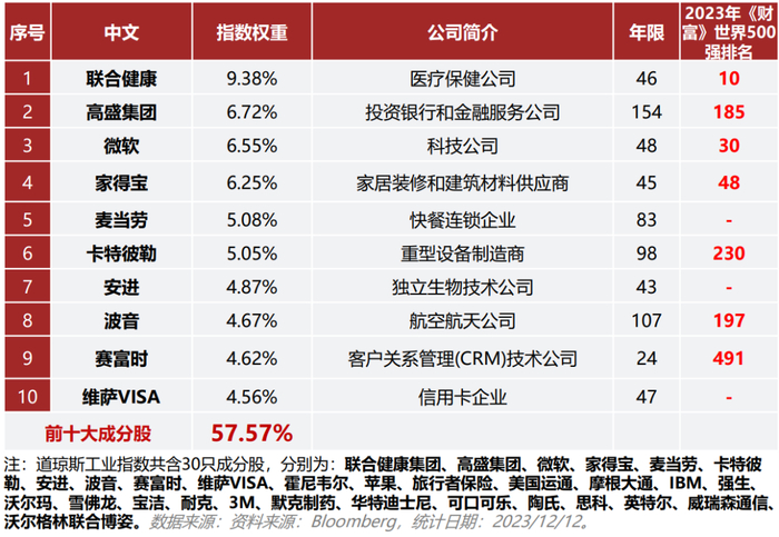 截至2023年12月12日,道指前5大行业及其占比分别为:金融-20.4%、消费-20.2%、医疗保健-19.7%、信息技术-19.3%、工业-14.4%。既涵盖了科技属性强的成长板块,又囊括了业绩稳定的价值板块。(数据来源:Bloomberg,统计日期截至2023/12/12)