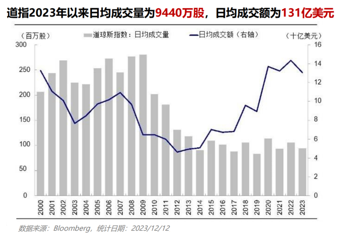 另外,从流动性上来看,得益于选取的成分股通常为美国市值较大且具有广泛流动性的公司,具有规模巨大的市场参与者和日成交量,道琼斯工业指数的流动性水平相对更高,且能在较长的时间跨度内保持相对稳定的高流动性。