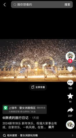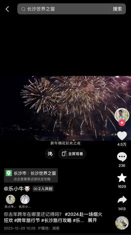 除此之外,线下活动举办期间,抖音在线上同步发布话题#2024赴一场烟火狂欢 ,将热度快速转变为流量。@乐小牛、@长沙小叮当、@胖虎的旅行日记等抖音达人纷纷上传烟火秀视频,话题登上抖音热点榜TOP4和种草榜TOP2,截至目前播放量超4.1亿次,超过794万人通过视频种草并获得了游玩乐园信息。
