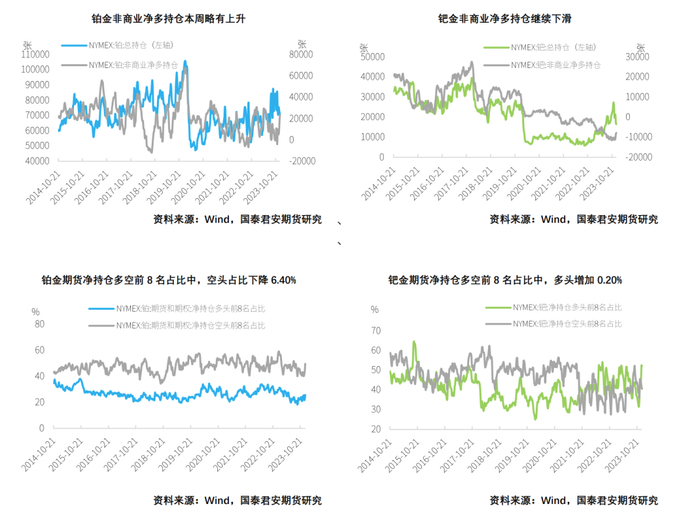 本周数据没有更新,回顾上周数据(12月25日-12月29日),铂金和钯金期货市场经历了一定的波动。铂金方面,NYMEX铂金期货总持仓略有增加,从上周的70,953张上升至本周的72,263张,涨幅为1.84%。非商业多头持仓微降,从上周的44,404张减至40,385张,减少了4,019张。非商业空头持仓也略微下降,从上周的20,742张减至23,387张,增加了2,645张。非商业净多持仓略有上升,从上周的23,662张增至16,998张,增幅为39.57%。在净持仓多空前8名占比上,铂金多头占比略有减少,从上周的25.70%减少至本周的22.20%,减少了3.50%;空头占比也下降,从上周的49.60%减至本周的43.20%,减少了6.40%。钯金方面,NYMEX钯金期货总持仓下降,从上周的16,495张减至20,242张,减少了3,747张。钯金非商业多头持仓也略有下降,从上周的4,022张降至4,272张,减少了250张。钯金非商业空头持仓增加,从上周的11,823张上升至12,652张,增加了829张。钯金非商业净多持仓继续下滑,从上周的-7,801张减至-8,380张,下降幅度为7.43%。在净持仓多空前8名占比上,钯金多头占比增加,从上周的52.30%增加至本周的52.50%;空头占比也增加,从上周的40.60%增加本周的41.80%,增加了1.20%。