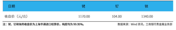 根据上海华通的数据显示,截至1月5日,99.95%现货铑金进口结算价为1170元/克,与上周持平。99.95%现货钌金进口结算价为104元/克,下降1.89%。99.95%现货铱金进口结算价为1340元/克,下降4.63%。