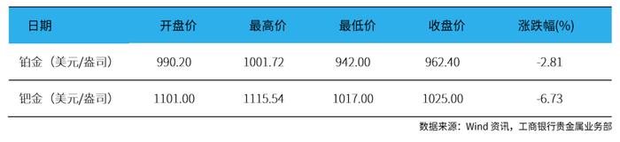 本周( 1月01-07日,下同 ),现货铂金开盘价为990.2美元/盎司,最高价为1001.72美元/盎司,最低价为942美元/盎司,收盘价为962.4美元/盎司,周累计下跌2.81%。现货钯金开盘价为1101美元/盎司,最高价为1115.54美元/盎司,最低价为1017美元/盎司,收盘价为1025美元/盎司,周累计下跌6.73%。