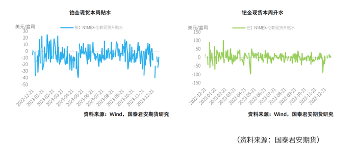 截至2024年1月5日,铂金和钯金市场呈现以下表现:伦敦现货铂金以美元计价为948.00美元,期货收盘价(活跃合约)为957.00美元。铂金的NYMEX-伦敦现货升贴水为-9.00美元/盎司。全球铂金ETF持仓量略微下降,从上周的291.7万盎司减至本周的293.82万盎司,减少了1.35万盎司。铂金库存持续稳定,保持在217,067.81盎司的水平。伦敦现货钯金以美元计价为1,003.00美元,期货收盘价(活跃合约)为1,000.50美元。钯金的NYMEX-伦敦现货升贴水为2.50美元/盎司。全球钯金ETF持仓量增加,从上周的48.69万盎司上升至本周的51.55万盎司,增加了2.86万盎司。钯金库存减少了205.31盎司,从上周的43,476.69盎司减至43,271.38盎司。