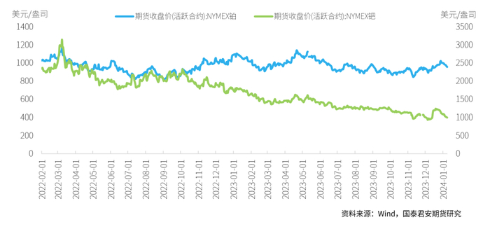 贵金属和基本金属—铂族金属和工业金属颇具价值截至。12月27日,COMEX 黄金和白银期货走高,但NYMEX铂族金属的价格却明显低于2022年底的价格。连续合约图表显示,铂金从2022年12月29日的1073.70美元跌至12月27日的 998.70美元,跌幅近7%。钯金的跌幅更大,从2022年12月底的1789.30美元跌至2023年12月27日的1160.50美元,跌幅达35.5%。铂金和钯金在2023年表现不佳,但不意味着以后不会有亮眼的表现。2024年,铂金和钯金价格水平,颇具价值,上涨潜力巨大,下跌风险有限。