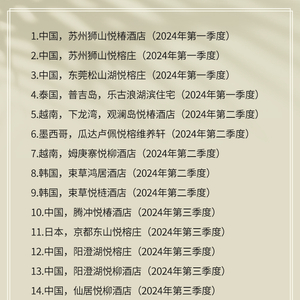 在这份名单中,在中国开业的酒店占了一半以上。包括第一季度开业的苏州狮山悦椿酒店、苏州狮山悦榕庄、东莞松山湖悦榕庄;第三季度开业的腾冲悦椿酒店、阳澄湖悦榕庄、阳澄湖悦柳酒店、仙居悦柳酒店、长春北湖鸿居酒店、珠海横琴鸿居酒店;第四季度开业的大连金石滩悦苑舍。