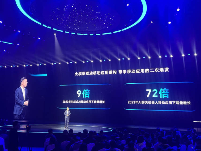 移动互联网时代有800多万移动应用,近几年移动应用的上架数量、下载量逐渐趋于平缓,但去年由大模型驱动的AI原生应用的兴起,拉开了新一轮增长势头。据统计,2023年生成式AI移动应用下载量翻了9倍,其中,AI聊天机器人增⻓了72倍。