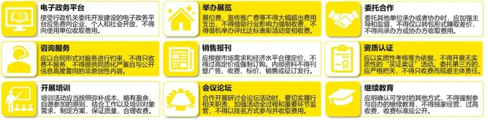 ► 行业协会商会禁止存在利益关联、强制收费活动、利用行政权力与资源强制收费、哄抬价格、囤积居奇、价格串通等混乱收费以及操纵市场价格的不当收费行为。
