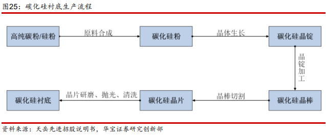 以碳化硅材料为衬底的产业链主要包括碳化硅衬底材料的制备、外延层的生长、器件制造以及下游应用市场。从工艺流程上看,碳化硅一般是先被制作成晶锭,然后经过切片、打磨、抛光得到碳化硅衬底;衬底上生长单晶外延材料。外延片经过光刻、刻蚀、离子注入、沉积等步骤制造成碳化硅功率器件和碳化硅射频器件。将晶圆切割成die,经过封装得到器件,器件组合在一起放入特殊外壳中组装成模组。