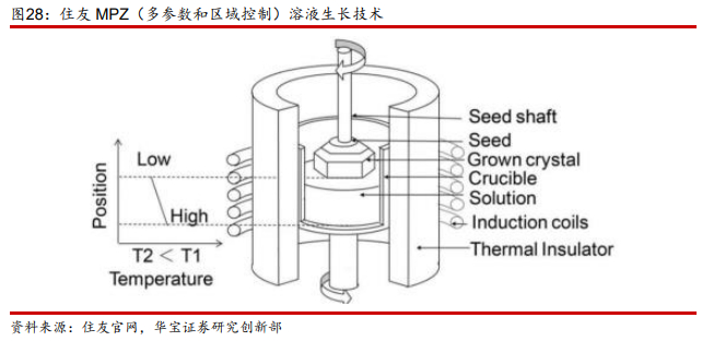 改进碳化硅长晶及加工工艺以提高良率等也是降低成本的有效方式。目前国内6英寸良率约40-50%,海外约60-70%,较低的良率使得有效产能减少从而成本增加。长晶慢、质量低、大尺寸难度高、加工工艺不足带来的损耗等方面都是造成良率降低的因素,目前头部厂商正积极通过技术改进来提升良率,如2021年8月5日,住友官网提到了他们利用一种所谓的MPZ技术,生长了高质量、低成本的SiC衬底和SiC外延片,消除了表面缺陷和基面位错(BPD),无缺陷区(DFA)达到99%,相比PVT法,SiC长晶速度提高了5倍左右,相比普通的LPE法速度提升了200倍。但目前国内厂商的良率水平与海外厂商还存在一定差距。