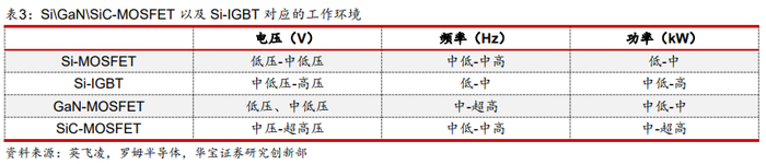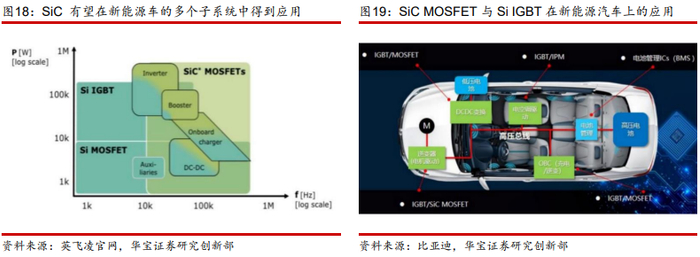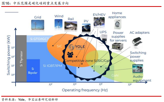 碳化硅在主驱、OBC、DC/DC系统、充电桩中均已开启对硅基IGBT或超级结器件的替代。不同子系统的输出功率、工作频率需求有一定差别,主驱逆变器为大功率低频场景(功率100KW以上,工频50KHz以下);车载充电机OBC和DC/DC系统为小功率高频场景(车载充电机OBC:功率3.3KW-22KW,工频100KHz-300KHz)、DC/DC:功率3KW,工频100KHz以上);充电桩为中低功率中高频场景(功率22KW-100KW,工频50KHz-100KHz)。