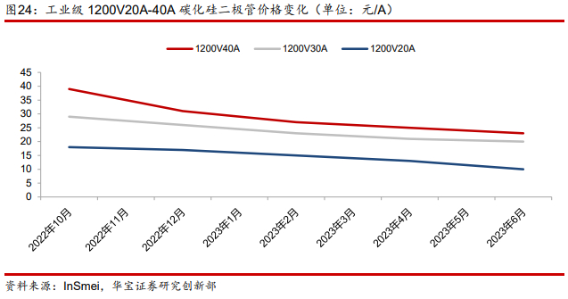 碳化硅器件在光储逆变器中应用比例持续增加,光储市场的竞争相比车规产品更为激烈。从2010年以来,光伏逆变器厂商就已经采用碳化硅二极管替代硅基器件使用,随着国产二极管价格的下降,越来越多的企业开始大批量使用碳化硅,2023年5月上海SNEC2023展上,英威腾XG PLUS、上能电气320kW组串逆变器、迈格瑞能G2混合逆变器等众多参展产品都采用了碳化硅技术,光伏企业与碳化硅芯片企业合作案例也在增加,如上能电气与安森美达成战略合作、科士达与意法半导体深化合作等。比车规产品光伏市场的竞争相对更为激烈,一方面,光伏市场产品验证周期相比车规产品更短,进入门槛更低,竞争对手更多;另一方面,由于2023年下游逆变器企业处于产能出清周期,受到海外需求增速下滑和库存的影响,下游竞争加剧,价格竞争也同样传导到上游。根据InSmei调研,国内工业碳化硅二级管的价格今年以来跌幅明显,截止到2023年6月,国内碳化硅二级管的价格已接近0.5元/A,跌幅超30%。未来,碳化硅二极管价格的下降也有望进一步提升对SiIGBT的替代。