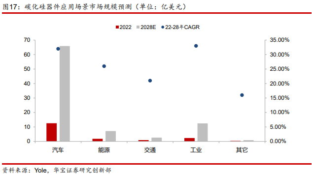 新能源汽车是未来碳化硅应用的主要驱动力,预计未来占据碳化硅需求的主要市场。根据 Yole 的数据,2022 年碳化硅功率器件市场规模为 18 亿美元,2028 年有望达到 89 亿美元,22-28 年 CAGR 高达 31%。碳化硅功率器件可应用于汽车、能源、交通、工业等多个领域,其中汽车占据主导地位,市场规模占比超过七成,2022 年市场规模为 13 亿美元,2028年有望达到 66 亿美元,22-28 年 CAGR 高达 32%。