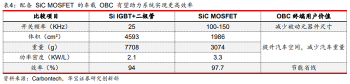 2)车载充电机OBC:SiC MOSFET有望替代Si MOSFET或二极管。车载充电机(OBC)与车外固定直流快速充电桩相比,由于安装于车内整体体积受限,且使用频率更高,直接影响客户补能体验,因此 OBC 对于功率密度、整机效率的要求一般高于其他车载电源零部件。通过SiC-MOSFET进行替代,可以减少散热器、被动元件尺寸、简化电路,实现效率的提升。目前,OBC供应商已经开始推广配备SiC器件的产品,部分也采用了国产器件。根据电子发烧友网,目前国内碳化硅芯片在OBC的渗透率已经达到60-70%。