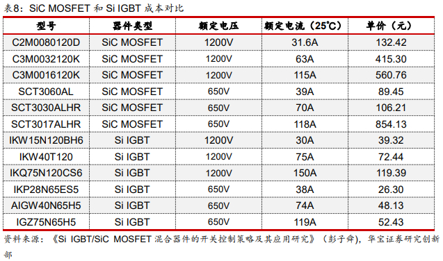 而最重要的原因在于成本问题,受高昂SiC材料成本、复杂器件制作工艺以及较低产品良品率等因素的影响,SiC MOSFET的成本与同类Si IGBT分立器件相比仍然有较大差距,这阻碍了SiC器件大规模的产业化推广。碳化硅商业化的关键在于下游对碳化硅器件成本和碳化硅器件优越性能带来的综合成本下降间的平衡。虽然碳化硅衬底和器件工艺逐渐成熟,衬底和器件的价格呈一定下降趋势,但是目前碳化硅功率器件的价格仍数倍于硅基器件,SiC MOSFET分立器件的单价是Si IGBT分立器件成本的3~15倍,且随着载流能力的提升,价格差距也越来越大,下游应用领域仍需平衡碳化硅器件的高价格与碳化硅器件优越性能带来的综合成本下降间的关系,短期内一定程度上限制了碳化硅器件在功率器件领域的渗透率,使得碳化硅材料即使在部分相对优势领域的大规模应用仍存较大挑战。但是,在 SiC 器件成本难以对 Si 实现平价化的前提下,我们认为碳化硅依然存在商业价值,其核心原因在于以半导体成本的提升换取系统效率的提升,最终可以带来系统成本降低,或帮助下游客户在产品的全生命周期内实现更大的经济利益,在碳化硅成本逐步下降的同时,下游市场也有望迎来较大规模成长。