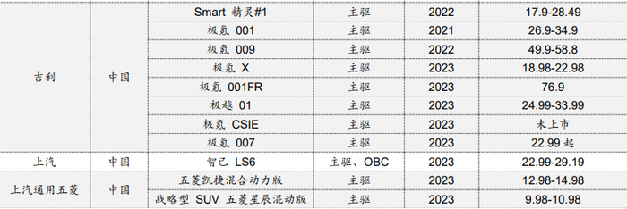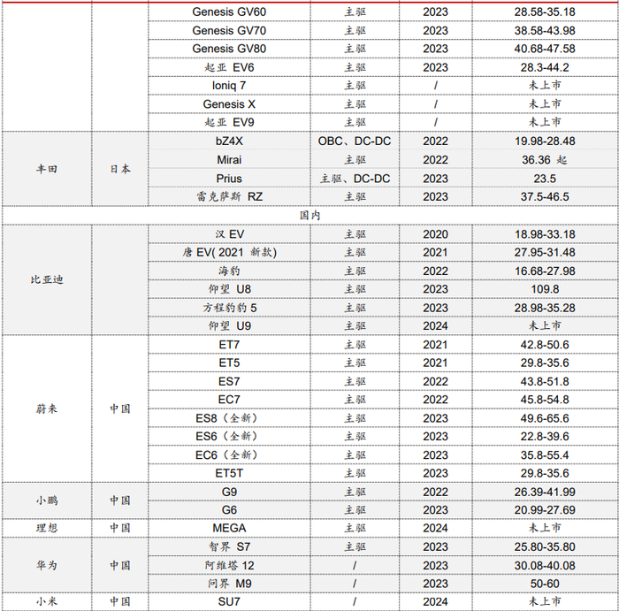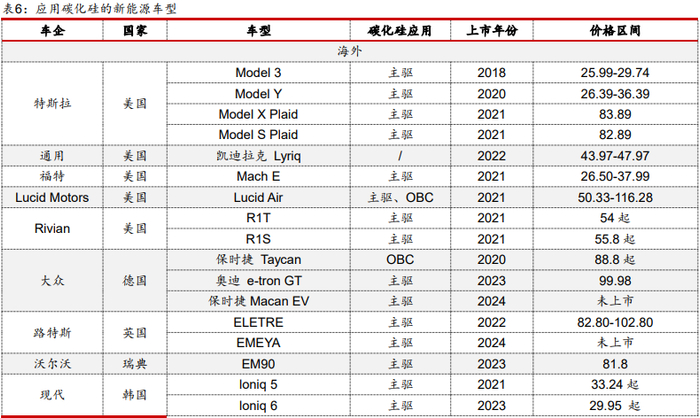800V快充趋势加速碳化硅上车,碳化硅装车逐渐向中端车型渗透。后续要跨越电动车渗透率鸿沟,获得主流消费者广泛的支持,推广快充是必然之路,提高充电功率可以实现快充,基于功率kW=电流A×电压V,快充可通过高电压或大电流实现,而充电电流加大意味着更粗更重的线束、更多的发热量以及更多附属设备瓶颈,而充电电压提升则有更大的设计自由度,这直接推动了400V 电压平台向 800V 电压平台转换。800V快充是目前最有可能改变电动车里程焦虑的新技术,我们判断800V是未来的必然趋势。碳化硅MOSFET在800V快充具有无可替代的优势,电压升高后硅基 IGBT 的导通损耗、开关损耗都有显著上升,增本降效使得800V 的实际经济性大为降低,因此在 800V 电压平台中,企业更倾向选择高频低损耗的碳化硅 MOSFET 方案,因此目前 800V 电控乃至配套的OBC大部分已选用或规划采用碳化硅 MOSFET 器件。2023年碳化硅装车向中端车型渗透趋势明显,根据汽车之家数据,23 年有小鹏 G6、极氪 X、智己 LS6 等多款 20-25 万元价格段的标配碳化硅车型上市。