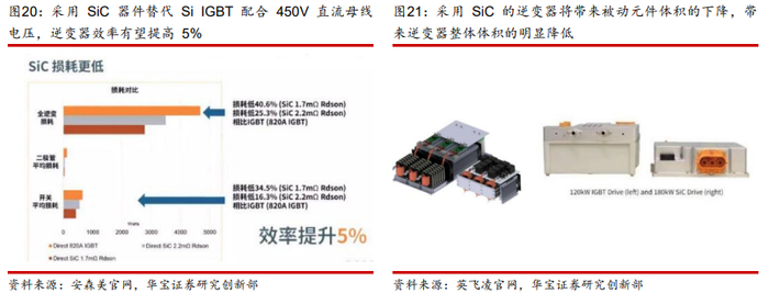 1)主驱:SiC MOSFET有望替代Si-IGBT。在同样的电压下,SiC MOSFET与Si-IGBT相比有望助力逆变器输出更大的功率,根据安森美的数据,以 A 级车用电控为例,以1.7mohm/2.2mohm 内阻的 SiC 模块直接替换 820A 规格的 Si-IGBT 模块,全逆变损耗有望降低45.3%/25.3%,开关平均损耗有望降低 34.5%/16.3%,在不改变 450V 直流母线电压的情况下,系统效率提升 5%;根据英飞凌的测试,若将电压提高到800V后,使用SiC MOSFET替代Si-IGBT有望将系统效率提升7.6%。SiC MOSFET与Si-IGBT相比具有降低电机损耗、降低开关损耗,提高系统能量转化效率,带来更小的体积和更长电池续航时间,可以使电驱系统在高温高压环境下保持高速稳定运行。特斯拉Model 3是市场上最早在主驱逆变器里,使用基于碳化硅材料的碳化硅MOSFET,以替代传统的硅基IGBT的车型,而后现代、起亚、通用等国际知名车企和国内的比亚迪、蔚小理、吉利等相关企业也相继推出相关车型。根据罗姆的预测,2023年开始,电机控制器中的SiC比率将会迅速上升,渗透率将会从2022年的9%增长到25%。预计到2025年,SiC在电机控制器中的渗透率将高达40%。