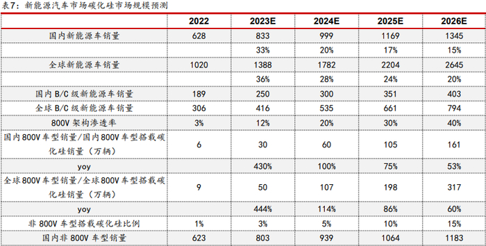 我们基于以上分析和以下假设对新能源汽车市场碳化硅市场规模进行预测: