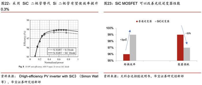 碳化硅优良的物理性能,在光伏组串式逆变器的应用中也具有较大前景。光伏产业也向“大组件、大逆变器、大跨度支架、大组串”方向发展,光伏电站电压等级将从1000V提升至1500V及以上,对功率器件的物理性能提出了更高的要求。光伏逆变器作为碳化硅器件的另一大主要应用场景,也迎来新的发展机遇。未来更主流,装机贡献更大的组串式逆变器有望受益于 SiC 优良的物理特性,来实现系统的降本提效,并在“平价上网”的市场环境下有望为终端用户创造更大经济价值。根据 Simon Wall 等人在《High-efficiencyPV inverter with SiC》的研究中,在 50KW 的组串式逆变器中,Si 二极管被 SiC 二极管替代后有望实现 0.3%的系统效率提升。根据天科合达招股说明书,使用全SiC MOSFET 或 SiC MOSFET 与 SiC SBD 结合的功率模块的光伏逆变器,转换效率可从96%提升至 99%以上,能量损耗降低 50%以上,设备循环寿命提升 50 倍。