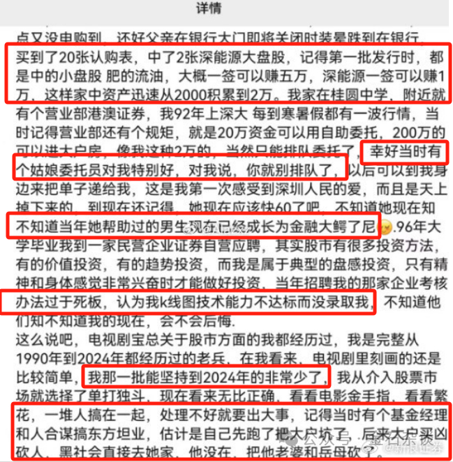 6)自己是1990年到2024年都经历过的老兵,当时能坚持到2024的非常少了,自己选择单打独斗比较证券。很多扎堆搞的,处理不好就出大事了。