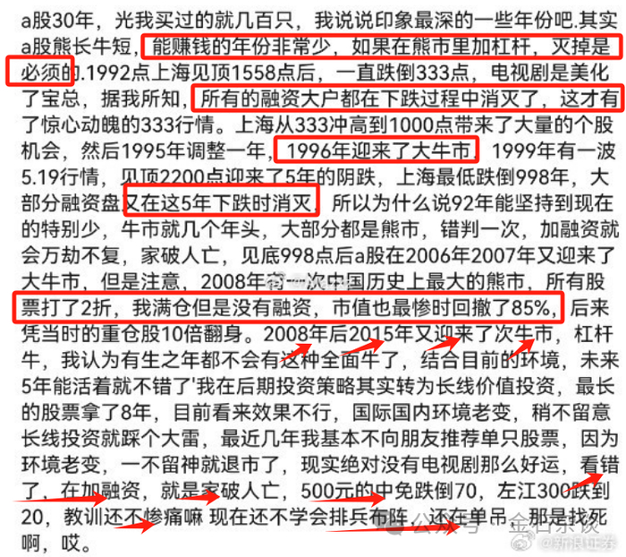 8)2008年那波大跌,所有股票打了两,自己满仓没有融资,最惨时回撤85%,后来凭借重仓股10倍翻身,08年到15年又迎来了牛市;未来5年能活着就不错了;长线价值投资效果并不明显;基本不向朋友推荐单只股票,这种行情单吊是找死;
