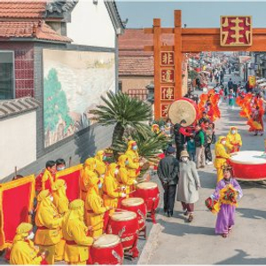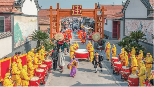 在山东利津县盐窝镇南岭村,“老街长巷”黄河大集进行开街锣鼓非遗民俗展演。