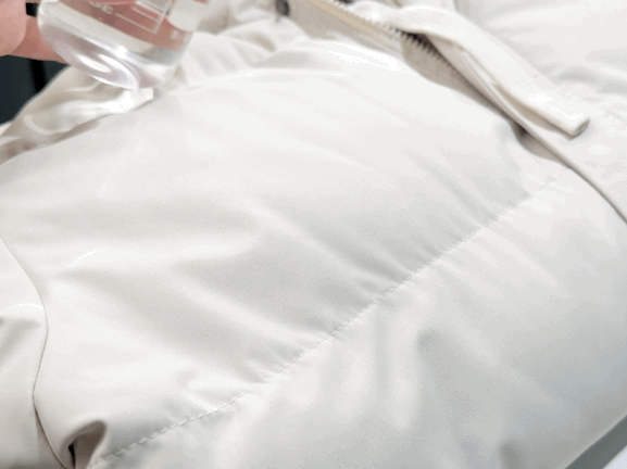 整杯水往上泼,遇水自动形成水珠滚落,不会渗进里头打湿衣服。