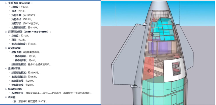 随后,我们基于GPT,来设计星舰的外观和内部主要结构。ChatGPT给出了星舰主要的尺寸参数,包括星舰飞船本体,超重型助推器、发动机、推进剂罐、液氧罐、甲烷罐、着陆腿等主要的尺寸参数,我们基于CAD工具实现部分还原。