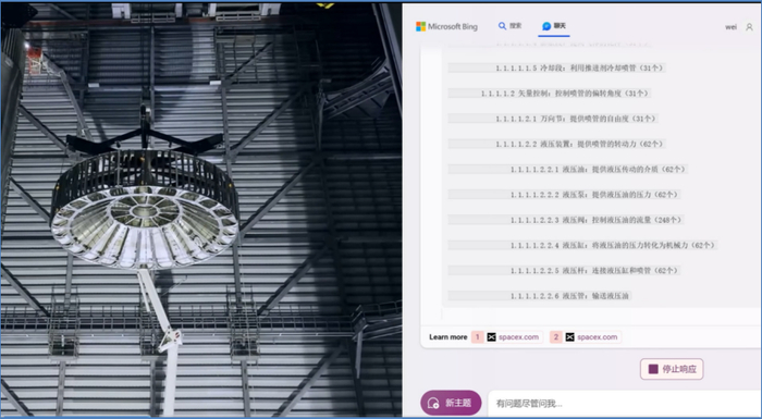 我们甚至还基于ChatGPT,尝试用它来还原SpaceX公司的星舰和猛禽发动机,AI对星舰进行了功能性设计,它告诉我们星舰由两个主要部件,超重型火箭和星舰飞船组成,并用提纲目录的形式,向下分解了星舰的主要功能、组件、数量和层级关系,从提供起飞和加速推力的超重型火箭,到猛禽发动机,燃烧室,喷管,喷嘴,一直向下分解到第6层级。AI开启了长达一个小时的功能性分解,生成了一份15页的功能设计树状图。