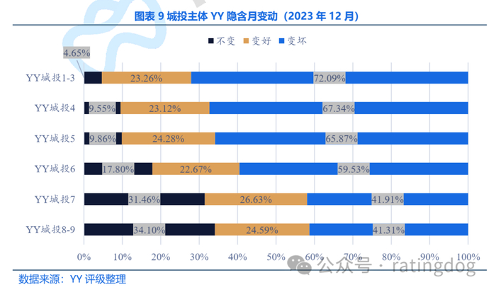 2023年12月城投主体隐含评级变坏的数量相对多(变好:变坏=599:1,314)。